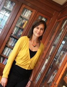Christine Piper in the Glenn Schaeffer library, standing in front of the 3,500 books in print by Iowa Writers' Workshop alumni. (Photograph: Guo Liang)